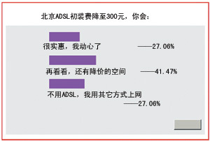 2002年12月,中國網(wǎng)通北京通信公司發(fā)起了一次降價活動,先是將原定今年12月20日到期的512k ADSL上網(wǎng)費的半價優(yōu)惠向后延續(xù)半年期限,緊接著,ADSL初裝費從最初的1300元降至300元,降幅達(dá)千元,動作之大、降幅之高,令業(yè)界嘩然。不難發(fā)現(xiàn),DSL不僅要延續(xù)原有的市場分額,還要搶占Cable Modem與以太網(wǎng)的半壁江山|