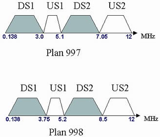 此標(biāo)準(zhǔn)從中國(guó)的實(shí)際情況出發(fā),既適應(yīng)接入網(wǎng)絡(luò)總體流量的非對(duì)稱特性,又考慮滿足一些對(duì)上行速率要求較高、接近對(duì)稱的業(yè)務(wù)需求;既考慮當(dāng)前技術(shù)和設(shè)備狀況,又兼顧未來技術(shù)發(fā)展和一段時(shí)期內(nèi)可能的業(yè)務(wù)需求,提出了中國(guó)的VDSL頻段劃分方式。這種方式在Plan998
