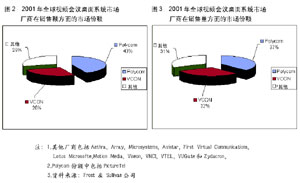 2002年年初,在IDC預測的本年度IT業(yè)界熱點技術(shù)中,視頻會議技術(shù)位居前列。而根據(jù)通信專業(yè)領(lǐng)域著名獨立研究機構(gòu)Wainhouse 的一份調(diào)查報告,2001年全球視頻通信領(lǐng)域僅設(shè)備市場,容量就達到近6億美元,占整個視頻會議市場52%的份額。Wainhouse還指出,2002年是視頻會議領(lǐng)域發(fā)展極為迅猛的一年,估計到2006年,整個視頻會議市場的市場容量將達到29億美元,比2001年增長20.4%。