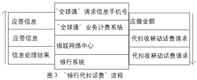 “銀行代扣話(huà)費(fèi)”方式 對(duì)于“由非銀行端發(fā)起,但需銀行代扣收的交易”,其執(zhí)行通過(guò)多種接入方式(如手機(jī)短消息、GPRS、客戶(hù)服務(wù)中心、自助終端、因特網(wǎng)等)提交信息,內(nèi)容包括“全球通”手機(jī)號(hào)、“神州行”手機(jī)號(hào)、IP電話(huà)卡號(hào)、付費(fèi)金額、銀行賬戶(hù)、密碼、交易類(lèi)型等。