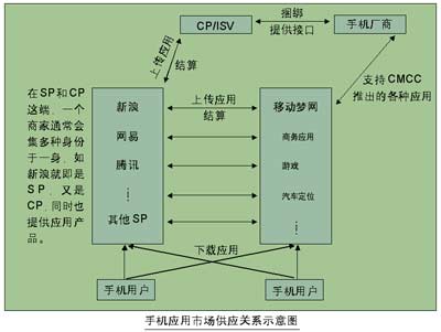 在這樣一個(gè)全新的銷售模式下,運(yùn)營商的作用也越發(fā)凸顯出來。“夢網(wǎng)是一個(gè)大的平臺(tái),SP是個(gè)小平臺(tái),SP再通過與CP建立合作,進(jìn)而將整個(gè)應(yīng)用市場與終端連接起來,F(xiàn)在,我們?nèi)康膽?yīng)用都放到夢網(wǎng)上面了!北本﹫(bào)童電子商務(wù)公司的一個(gè)工作人員說。移動(dòng)夢網(wǎng)的建立,事實(shí)上在手機(jī)廠商、應(yīng)用開發(fā)商、用戶三者之間搭了一個(gè)橋梁,將各種手機(jī)應(yīng)用集中在一個(gè)門戶網(wǎng)站,用戶需要時(shí),只需登陸到夢網(wǎng)上面,點(diǎn)擊相關(guān)的網(wǎng)頁,就可隨時(shí)下載所需要的應(yīng)用。