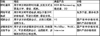 從結(jié)構(gòu)上,軟件視頻產(chǎn)品基本分為兩大類:一類是點(diǎn)對(duì)點(diǎn),另一類是一點(diǎn)對(duì)多點(diǎn)。點(diǎn)對(duì)點(diǎn)產(chǎn)品僅限于兩人之間的交流,此類典型產(chǎn)品有微軟的MSN和NetMeeting、Yahoo的雅虎通、QQ等;一點(diǎn)對(duì)多點(diǎn)產(chǎn)品用于多方的實(shí)時(shí)交流,此類產(chǎn)品是各種軟件解決方案的軟件視頻會(huì)議產(chǎn)品,如:北京捷先科技的WorldStar、威速公司的V2等。根據(jù)用途的不同,軟件視頻產(chǎn)品大致分為即時(shí)通訊產(chǎn)品(如MSN和NetMeeting、雅虎通、QQ)、網(wǎng)絡(luò)可視電話產(chǎn)品、視頻會(huì)議產(chǎn)品(如:V2)、多媒體實(shí)時(shí)交流平臺(tái)產(chǎn)品(如:WorldStar、WebEx、Interwise等),分類如表。