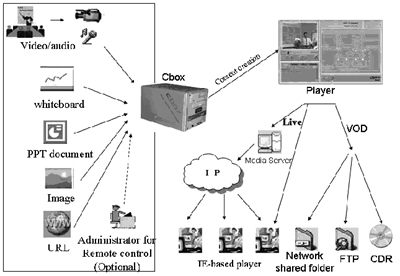 通過(guò)Cbox系統(tǒng),稅務(wù)局培訓(xùn)中心的講師只需預(yù)先將各種PowerPoint和圖片文件提供給Cbox,然后按照正常進(jìn)度進(jìn)行教學(xué)。Cbox可以自動(dòng)將攝像頭和麥克風(fēng)采集的講師的音視頻信號(hào)、白板信號(hào)、PowerPoint文檔前進(jìn)、后退、圖片和Internet資源URL進(jìn)行精確同步,制作出包含多種格式數(shù)據(jù)的數(shù)據(jù)流,然后以直播或點(diǎn)播的方式發(fā)布。用戶(hù)可以在自己的PC終端上通過(guò)IE瀏覽器同步觀看直播內(nèi)容,或者通過(guò)下載LAN共享目錄、FTP上的文件來(lái)觀看教學(xué)內(nèi)容。如果沒(méi)有網(wǎng)絡(luò)環(huán)境,還可以通過(guò)刻錄光盤(pán)后分發(fā)將培訓(xùn)內(nèi)容傳遞。而且因?yàn)橹恍鑇indows媒體播放機(jī)和IE瀏覽器就可正常播放,所以可以降低客戶(hù)端軟件安裝調(diào)試的工作量和費(fèi)用。系統(tǒng)中還有可供選擇的助教,他只需使用普通PC和IE瀏覽器,在講師不方便控制PowerPoint文檔等內(nèi)容的情況下,幫助講師完成相應(yīng)操作。另外一個(gè)可選的流媒體服務(wù)器,是用來(lái)支持大量用戶(hù)同時(shí)直播、點(diǎn)播需求。