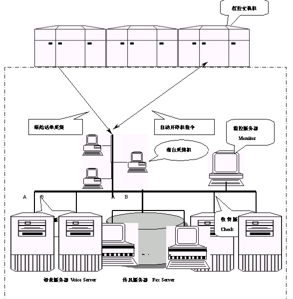 本系統(tǒng)可以分為:話單采集傳輸子系統(tǒng)、計費帳務(wù)處理子系統(tǒng)、收費服務(wù)子系統(tǒng)、語音查詢充值子系統(tǒng)、自動開停機(jī)子系統(tǒng)和監(jiān)控服務(wù)子系統(tǒng)六個模塊。