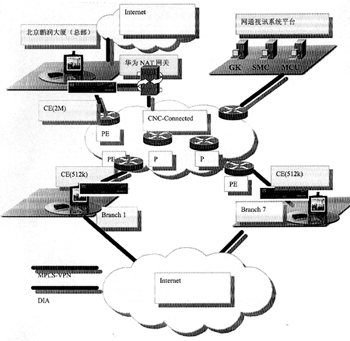 鑒于客戶是通信公司,有較強(qiáng)的系統(tǒng)管理能力,而且要求視訊和數(shù)據(jù)出口分開,視訊出口在北京,可以和VPN線路走相同的物理鏈路,不會造成路由設(shè)計上的問題,故將NAT放在客戶公司總部,由用戶自己管理,增加DIA出口和費用。網(wǎng)絡(luò)通信拓?fù)鋱D如右所示。