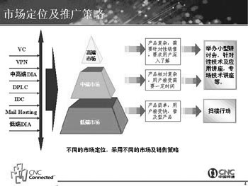 為了打開網(wǎng)通視訊業(yè)務的局面,網(wǎng)通的推廣方案也非常完備,這位負責人向記者出示了一張圖(見左下圖),詳細地解釋了網(wǎng)通視訊業(yè)務的市場定位及推廣策略。首先是通過媒體宣傳給客戶以整體印象,力求覆蓋面廣,眾所周知; 接著以直郵形式有針對性地發(fā)放詳細單頁資料,深入宣傳;然后以小型研討會、技術(shù)講座等形式,有針對性地召集當?shù)啬繕丝蛻?潛在用戶,細論VC市場及產(chǎn)品; 最后是以巡展、樣板客戶案例造聲勢,提高產(chǎn)品形象。