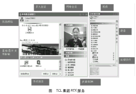 RTX產品支持標準的SIP、H.323 IP電話協(xié)議,并采用高質量的QoS技術保證實時通信網絡質量,使得TCL集團公司的用戶可以與同事之間采用語音或者視頻的面對面的交流(如圖),相當于給集團公司的任何一位RTX用戶配備了一部集成的視頻和語音電話。目前這項服務在集團公司非常受歡迎,尤其是遠程的代表處和集團總部之間的信息交流更直接、更快捷,在一定程度上取代了電話的功能,大大節(jié)約了通信費用。比如,TCL空調的計劃部每天需要和全國20多個代表處的計劃處進行數據往來,以前需要電話完成的功能現(xiàn)在通過RTX的即時文字、短信和語音對講完成,大大提高效率,節(jié)省了通信成本。