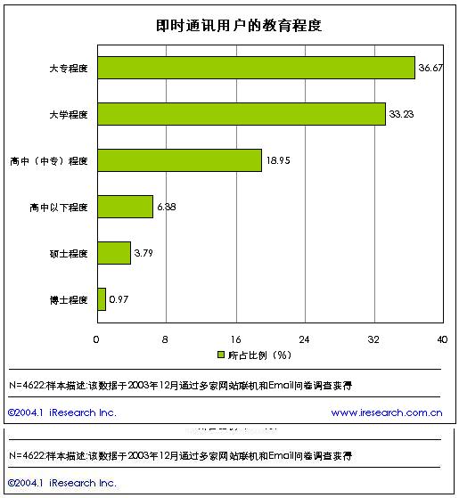 從即時通訊用戶的學(xué)歷水平來分析,在目前的即時通訊用戶中,大專以上教育程度的用戶比例達(dá)到了75%,占據(jù)了絕對高的比例。顯示出即時通訊用戶的整體教育水平非常高。