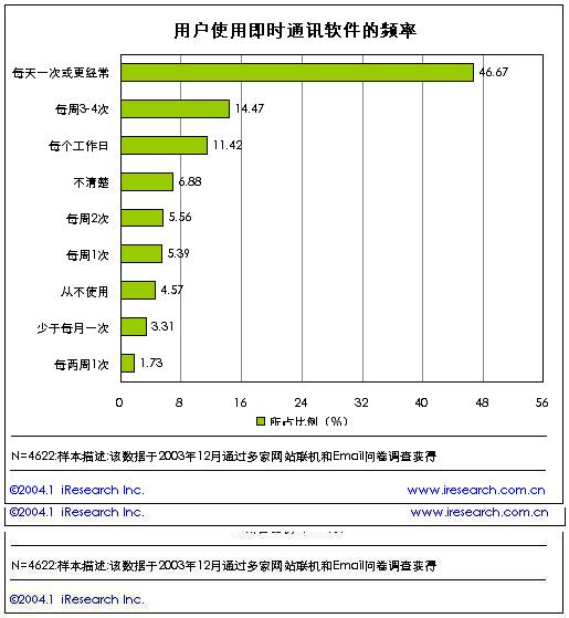 即時通訊所擁有的實(shí)時性、跨平臺性、成本低、效率高等諸多優(yōu)勢,使之成為網(wǎng)民們最喜愛的網(wǎng)絡(luò)溝通方式之一。從用戶使用即時通訊軟件的頻率來看,是比較高的。根據(jù)我們的調(diào)研結(jié)果,58%的用戶至少每天使用一次即時通訊軟件,使用頻率在每周一次以下的用戶比例僅為15%。