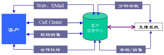 CRM系統(tǒng)的實(shí)施與企業(yè)的內(nèi)部和外部系統(tǒng)緊密相關(guān)。其涉及市場、營銷、銷售、實(shí)施、客戶服務(wù)與支持等一系列循環(huán)過程。一個(gè)完整的CRM系統(tǒng)不僅包含與客戶的多方位的多渠道接觸外,還包含市場的定位和分割,營銷策略的制定和客戶細(xì)分,銷售機(jī)會(huì)的把握,銷售的執(zhí)行(任務(wù)分派,任務(wù)的跟蹤),客戶的管理與分析,客戶的反饋與策略的評判等。從而再重新修正市場策略。這樣一個(gè)循環(huán)過程涉及管理、市場、客戶、產(chǎn)品、數(shù)據(jù)分析與處理等多學(xué)科的知識(shí)與技術(shù)。