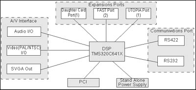 ATEME公司開發(fā)的NVDK板,基于TI公司的TMS320C64系列DSP,板上DSP為TMS320C6415或TMS320C6416,工作頻率600MHz。體系結構圖如左: