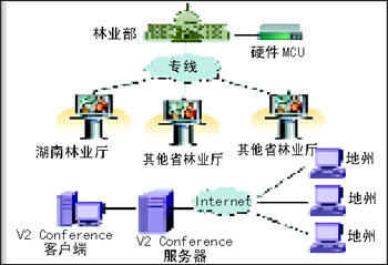 湖南省林業(yè)廳是省政府行業(yè)電子政務(wù)系統(tǒng)的示范單位,非常重視計算機網(wǎng)絡(luò)平臺上的各種軟件應(yīng)用。為了減少會議支出,提高辦公效率,湖南省林業(yè)廳經(jīng)過廳務(wù)會研究決定,希望充分利用全省十四個地州市現(xiàn)有的計算機和音響設(shè)備建立全廳的網(wǎng)絡(luò)視頻會議系統(tǒng)。在經(jīng)過公開競標后,V2產(chǎn)品憑借著其優(yōu)越的性能價格比和售后服務(wù)保證,成功中標。