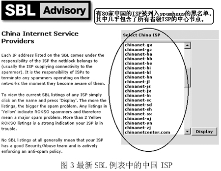 垃圾郵件損害的不只是中國的國際形象,中國反垃圾郵件聯(lián)盟的葉豪告訴記者,類似SBL(更一般的是RBL,即“實(shí)時(shí)黑名單”)這樣的服務(wù)是由國外的一些公司或第三方組織提供的,目前已經(jīng)成為國際上比較通行的防范垃圾郵件的措施。而在具備較高知名度的Spamhaus所維護(hù)的這份黑名單中,我國的ISP竟然多達(dá)80家(如圖3),幾乎所有的省級(jí)ISP都位列其中!爸袊芏啻蟮腎SP都在不同的‘黑名單’里,從這些國內(nèi)ISP發(fā)出的郵件,那些用‘黑名單’的客戶根本就收不到,F(xiàn)在‘黑名單’是比較好用的一種辦法,所以使用‘黑名單’服務(wù)的企業(yè)也越來越多,國際上針對(duì)中國的信息壁壘就越來越厲害,再不采取措施,中國就等著被全世界‘封掉’吧!”