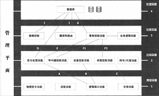 控制平面處于第二層,提供控制功能,如信令處理、承載連接控制、設(shè)備控制、呼叫腿(Leg)控制、網(wǎng)守(Gatekeeper)和代理信令等功能。其中:參考點(diǎn)D位于信令處理功能和數(shù)據(jù)庫(kù)功能之間,采用TCAP信令;參考點(diǎn)E在信令處理功能和會(huì)話控制功能之間,采用TCAP信令,用于IN請(qǐng)求等傳送,業(yè)務(wù)邏輯對(duì)呼叫的控制等消息傳送;參考點(diǎn)F1、F2分別采用呼叫控制API和承載連接控制API,如TAPI、JTAPI等?刂破矫媾c外界的接口2采用H.323(H.225/H.245)、SIP、TCAP(TCAP/SCCP/M3UA/SCTP/IP)等協(xié)議和信令。