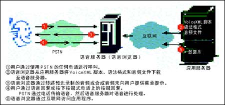 由于電話(包括很多蜂窩電話)沒有計算功能,無法管理語音瀏覽器,所以語音瀏覽器駐留在網(wǎng)絡上的語音服務器中。語音服務器可以位于企業(yè)數(shù)據(jù)中心,或者位于主管供應商處。用戶撥叫一臺語音服務器,該服務器從一臺應用服務器上下載VoiceXML 2.0腳本、語法格式和聲音文件。語音瀏覽器以一種語音信息的形式將VoiceXML 2.0腳本翻譯給用戶聽,語音信息可以是預先錄制的語音,或經(jīng)由一個文本語音合成器產(chǎn)生的文本。然后語音瀏覽器調用一個自動語音識別(ASR)軟件,使用語法格式來識別出用戶響應的語音詞匯。