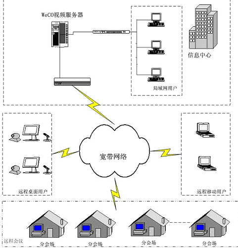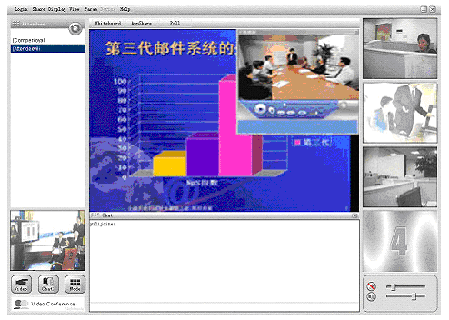 計算機(jī)、網(wǎng)絡(luò)技術(shù)高速發(fā)展的今天,傳統(tǒng)的通訊方式日益滿足不了人們的要求。人們要求能進(jìn)行遠(yuǎn)程會議,開展面對面的交流;同時,在滿足傳統(tǒng)視頻會議音/視頻通信的基本要求之外,現(xiàn)代會議更希望能夠提供更加豐富多樣的會議討論形式和功能,比如:遠(yuǎn)程開展季度/年度預(yù)算及工作計劃的討論,需要遠(yuǎn)程共享PPT等演示文檔和EXCEL等表格,需要共同就某一網(wǎng)上信息開展討論,甚至能夠?qū)㈤_會的通知通過電子郵件和手機(jī)短消息的方式傳達(dá)到每一個與會者那里。