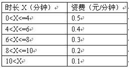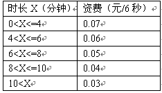 例3,國內(nèi)長途話費在時長不超過4分鐘的情況下,按0.07元/6秒收;超過4分鐘但不超過6分鐘,統(tǒng)一按0.06元/6秒收。怀^6分鐘但不超過8分鐘,統(tǒng)一按0.05元/6秒收取;超過8分鐘但不超過10分鐘,統(tǒng)一按0.04元/6秒收。怀^10分鐘,統(tǒng)一按0.03元/6秒收取。