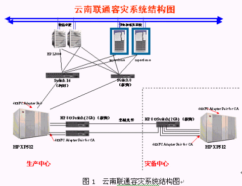 本期工程采用了HP高端磁盤陣列XP512進行遠程數(shù)據(jù)容災,在云南聯(lián)通業(yè)務中心本地新增一臺HP XP512。同時,在異地備份中心新增一臺XP512存儲服務器,作為主生產(chǎn)中心XP512的異地容災備份。本次容災的建設目標是對綜合營帳系統(tǒng)、專業(yè)計費、短消息計費系統(tǒng)進行同城異地數(shù)據(jù)級容災的綜合數(shù)據(jù)容災系統(tǒng),業(yè)務系統(tǒng)的數(shù)據(jù)將可以通過基于XP磁盤陣列的Continuous Access XP軟件實時同步復制到備份數(shù)據(jù)中心的XP512中,從而實現(xiàn)數(shù)據(jù)的遠程保護