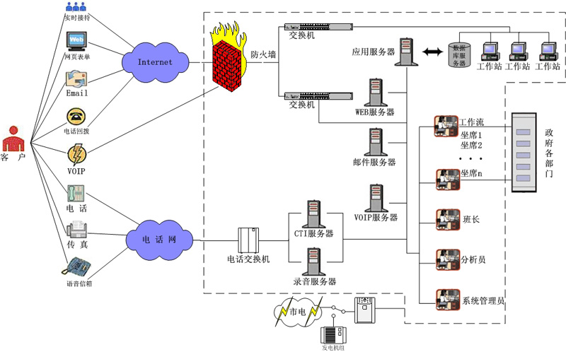 1.呼叫中心:提供傳統(tǒng)呼叫中心功能,實(shí)現(xiàn)電話(huà)網(wǎng)絡(luò)的呼入呼出、座席管理和數(shù)據(jù)庫(kù)維護(hù)等;