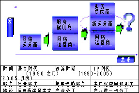 Switch(軟交換)、3G、IPv6等技術(shù)進(jìn)行系統(tǒng)構(gòu)筑,全面融合先進(jìn)的語音、數(shù)據(jù)及移動(dòng)通信IP一體化解決方案,從而為企業(yè)提供不同需求層次的選擇。另外,由此導(dǎo)致產(chǎn)業(yè)結(jié)構(gòu)也悄悄地發(fā)生變化,產(chǎn)業(yè)朝三層級(jí)和多層級(jí)演變通信的新結(jié)構(gòu)和新角色:服務(wù)運(yùn)營(yíng)商的誕生,網(wǎng)絡(luò)運(yùn)營(yíng)商向服務(wù)提供商的轉(zhuǎn)型。