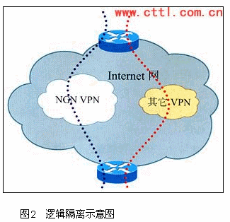 從圖1可以看出,物理隔離是指另外建設一張IP專網,主要是在匯聚層和骨干網層面上采用雙網結構:一張網絡承載Internet業(yè)務,稱之為Internet網,主要提供傳統互聯網業(yè)務,按照上網時間及內容收費。另一張網絡承載IP電信業(yè)務,提供高質量的電信級業(yè)務,滿足NGN,3G對承載網的需求,支持VPN,視訊,語音以及流媒體等業(yè)務的要求,稱之為IP專網。