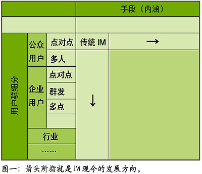 IT行業(yè)發(fā)展數(shù)十年,有一個(gè)共識(shí),或是一種經(jīng)驗(yàn)結(jié)論,大約是:在用“老工具解決新問(wèn)題”、“老工具解決老問(wèn)題”、“新工具解決老問(wèn)題”、“新工具解決新問(wèn)題”四者中,一般最先者最善,也極討巧,最后者則最為事倍功半。觀(guān)IM發(fā)展趨勢(shì),似乎介于“新工具解決老問(wèn)題”、“新工具解決新問(wèn)題”二者之間,就體現(xiàn)在表中兩個(gè)箭頭上,是以錢(qián)景堪憂(yōu)。