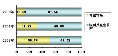 2004年,基于專線網(wǎng)絡的視頻會議系統(tǒng)與基于混網(wǎng)和企業(yè)公網(wǎng)的產(chǎn)品比例發(fā)生了轉(zhuǎn)折性變化,基于混網(wǎng)和企業(yè)公網(wǎng)的產(chǎn)品占到了68.8%的比例,成為了市場主流。計世資訊(CCW Research)研究表明:2005年,這一趨勢更趨明顯,基于混網(wǎng)和企業(yè)公網(wǎng)產(chǎn)品的比例將高達87.5%。
