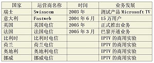 意大利FastWeb公司在歐洲IPTV發(fā)展中扮演了重要角色。其在IPTV經(jīng)營上的成功,改變了許多運(yùn)營商原先對IPTV的觀望態(tài)度。目前,除意大利外,英國、法國、瑞典、德國、摩納哥、挪威、比利時、荷蘭、奧地利等國也開通了IPTV業(yè)務(wù),其IPTV運(yùn)營商及業(yè)務(wù)推出時間詳見表5。
