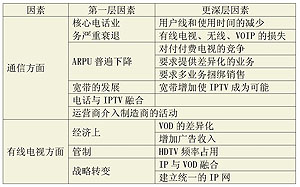 IPTV市場發(fā)展的驅(qū)動力主要有兩個方面:一是通信方面的因素,二是有線電視方面的因素(詳見表4)。