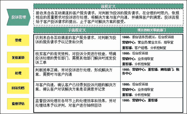 - 流程方面。投訴處理的后臺(tái)分屬不同的部門(mén),流程不統(tǒng)一,管理和考核指標(biāo)也不統(tǒng)一; 投訴等級(jí)的標(biāo)準(zhǔn)不明確,各渠道不統(tǒng)一; 缺乏投訴升級(jí)流程,缺乏對(duì)各流程、各處理環(huán)節(jié)的時(shí)限定義。