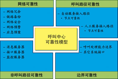 根據(jù)多年的實踐經(jīng)驗,對電信級呼叫中心提出如下高可靠性分析模型,如圖1所示。該模型將電信級呼叫中心可靠性分析分為四個維度:網(wǎng)絡可靠性、呼叫路徑可靠性、邊界可靠性、非呼叫路徑可靠性。