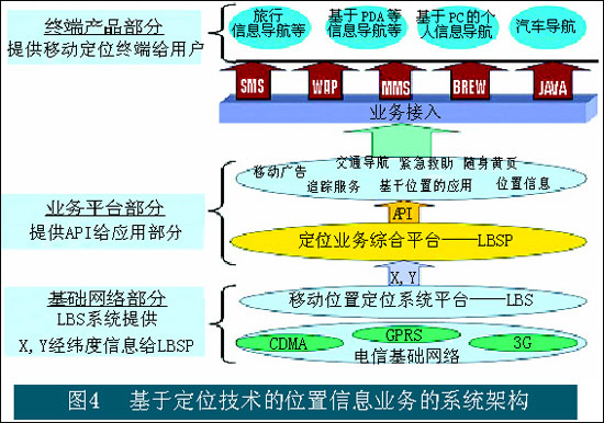 Service)兩大部分;業(yè)務(wù)平臺層面包括定位業(yè)務(wù)綜合平臺(Location-based Service Platform)和基于位置信息的應(yīng)用平臺等部分;業(yè)務(wù)接入平臺作為統(tǒng)一的接入環(huán)境支持目前存在的業(yè)務(wù)接入手段;終端層面則包括了移動終端提供商,以及具體的業(yè)務(wù)使用者。