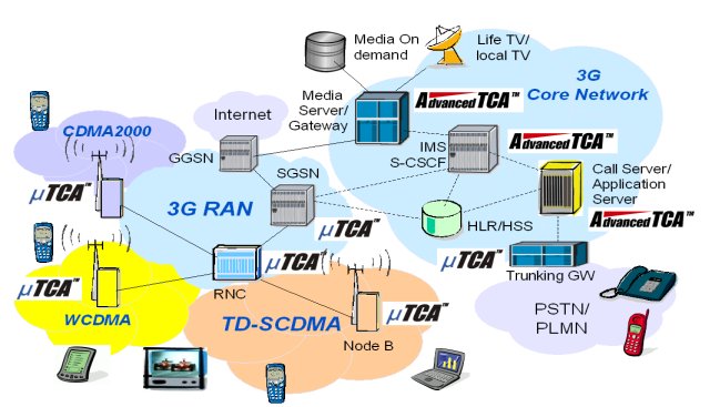 3G網(wǎng)絡中占主要地位的三個無線接入標準是WCDMA、TD-SCDMA與CDMA2000。3GPP與業(yè)界廠商對網(wǎng)絡結(jié)構(gòu)的標準化做出的杰出努力,為在世界范圍內(nèi)成功布署3G網(wǎng)絡業(yè)務起到了至關(guān)重要的作用。不過,3G網(wǎng)絡是復雜的系統(tǒng),包含有多種多樣的網(wǎng)元設備,AdvancedTCA與MicroTCA技術(shù)的出現(xiàn)把它的實現(xiàn)方式引向了標準化的道路,即通過商用組件快速、低成本地布署3G網(wǎng)絡,減少了各種獨立的實現(xiàn)方式的復雜性,提高了互操作性。