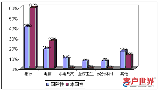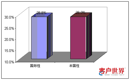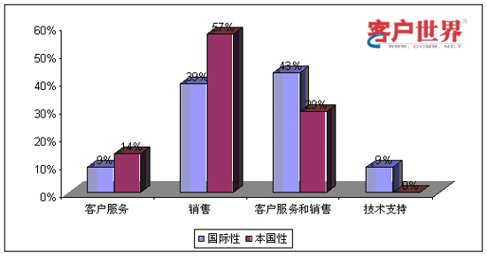 從業(yè)務(wù)功能看來,國際性呼叫中心和本國性呼叫中心承擔(dān)著不同的角色。9%的國際性呼叫中心和14%的本國性呼叫中心提供僅限于客戶服務(wù),例如賬號查詢和催費(fèi)收款。39%的國際性呼叫中心和59%的本國性呼叫中心專門展開網(wǎng)上營銷和銷售(外撥為主)。43%的國際性呼叫中心和29%的本國性呼叫中心同時承擔(dān)客戶服務(wù)和銷售功能。最后,我們調(diào)查到9%的國際性呼叫中心專門從事技術(shù)支持,而且這些中心專門為國際市場設(shè)立。服務(wù)功能上的差異會對商業(yè)定位和人力資源管理提出不同的要求。