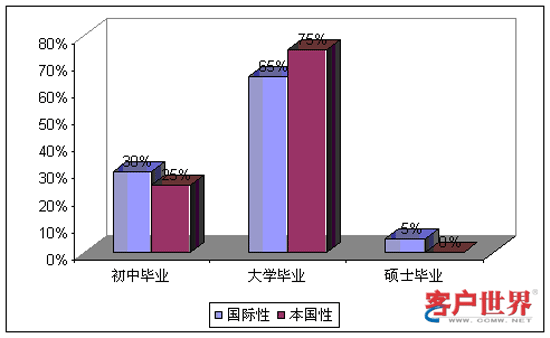 總的而言,參加調(diào)研的呼叫中心雇用的員工接受了平均15年的正式教育,也就是大學(xué)畢業(yè)的一般水平。國際性和本地型呼叫中心在勞動力的受教育水平上沒有呈現(xiàn)明顯差異。其中,30%的國際性和25%的本國性呼叫中心大量雇用初中畢業(yè)程度(12年教育)的員工;65%的國際性和75%的本國性呼叫中心雇用高中畢業(yè)程度(15年教育)的員工;此外,5%的國際性呼叫中心,往往是提供技術(shù)支持服務(wù),主要雇用碩士畢業(yè)水平(17年教育)的員工。