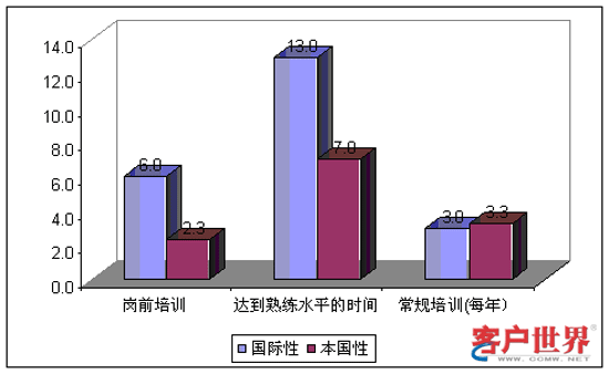 總體看來,印度呼叫中心提供平均為4.1周的崗前培訓(xùn)。其中,國際性呼叫中心平均提供6周崗前培訓(xùn),明顯高于本地性呼叫中心的2.3周。這是因?yàn)閲H呼叫中心把崗前培訓(xùn)的相當(dāng)一部分時間投入到英語能力的培訓(xùn)和提高上面。此外,參加調(diào)研的呼叫中心主管認(rèn)為,新員工平均在開始工作10周以后才能達(dá)到熟練水平。同樣地,我們發(fā)現(xiàn)國際性呼叫中心和本地性呼叫中心在這一指標(biāo)上存在顯著差異。在國際性呼叫中心需要達(dá)到熟練水平的時間