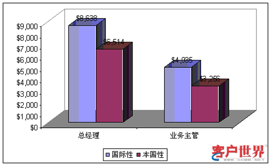 管理人員的薪酬水平明顯高于一線人員的薪酬水平。呼叫中心總經(jīng)理的年收入達(dá)到$8,194,其中在國際性呼叫中心為$8,638而在本地性呼叫中心為$6,514。對于業(yè)務(wù)主管來說,平均年工資為$4,253,其中在國際性呼叫中心$4,935而在本地性呼叫中心$3,256。