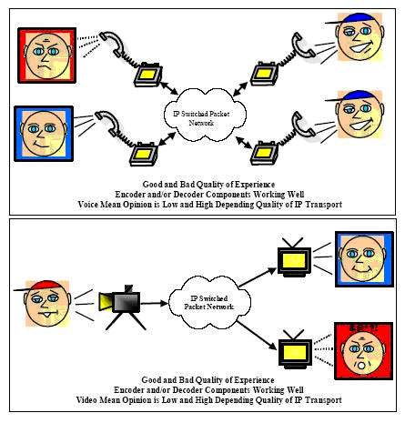 自然地,人們會向到將MOS或其它基于判斷的分值測量技術(shù)應(yīng)用于IP業(yè)務(wù)的質(zhì)量體驗測量。對于IP業(yè)務(wù),業(yè)務(wù)提供商的控制力是有限的,攜帶語音和視頻信息的數(shù)據(jù)包進(jìn)入IP網(wǎng)絡(luò)后,IP業(yè)務(wù)提供商能做的僅僅丟棄數(shù)據(jù)包、延遲數(shù)據(jù)包或者將數(shù)據(jù)包重新排序。