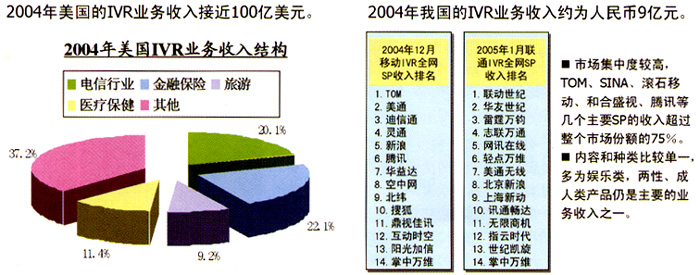 目前,國內(nèi)IVR的業(yè)務(wù)主要集中于為個人提供服務(wù)上,行業(yè)應(yīng)用所占比例較小,與成熟的國外市場以行業(yè)應(yīng)用為主的現(xiàn)狀形成巨大反差。而且,在為個人提供的語音業(yè)務(wù)中,國內(nèi)最受歡迎的仍是娛樂信息類中的聊天交友類業(yè)務(wù),這表明國內(nèi)個人用戶的需求層次較低;其次是娛樂和點播類的音樂類業(yè)務(wù);第三大類是游戲答題類,例如:知識競猜、有獎競猜、角色扮演游戲、互動游戲等;另外,IVR的數(shù)據(jù)業(yè)務(wù),如:短信、彩鈴、彩信等,受到近兩年國內(nèi)短信、彩鈴業(yè)務(wù)蓬勃發(fā)展的帶動,近兩年也呈現(xiàn)快速增長的良好勢頭。