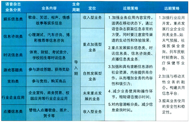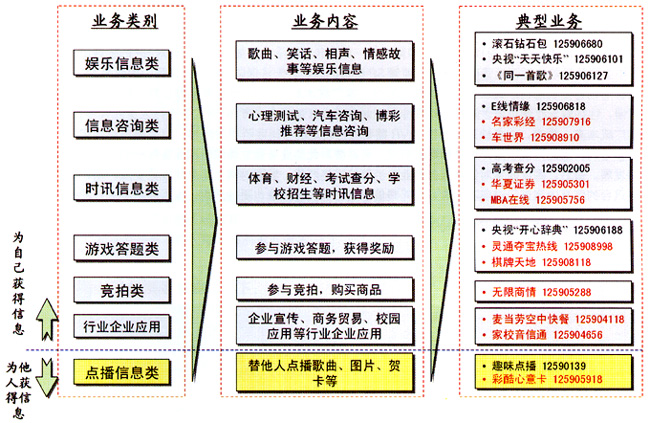 - 時訊信息類和信息咨詢類業(yè)務(wù),IVR優(yōu)勢較強,但業(yè)務(wù)范圍較窄,內(nèi)容較少,收入貢獻較低,同時部分業(yè)務(wù)容易受到SP信息源的制約。如果能進一步完善服務(wù),滿足用戶需求,業(yè)務(wù)將迅速發(fā)展,應(yīng)該定位于IVR短期發(fā)展的重點業(yè)務(wù)。