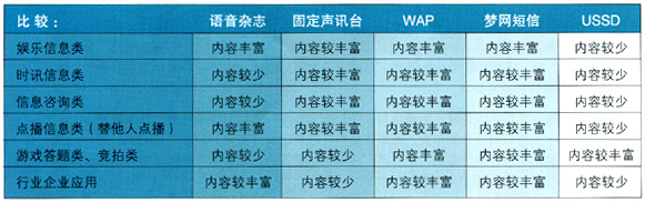 IVR與傳統(tǒng)聲訊服務(wù)的第二大區(qū)別在于使用用戶方面的區(qū)別。傳統(tǒng)聲訊大多是針對固定電話用戶設(shè)計的,固定電話的一個特征是使用者的不確定性,也就是說,同一個電話可能被多人共用。而移動電話的一個特征是用戶的專屬性和私有性,一臺手機在某種意義上可以相等于一個人的身份。所以,這方面區(qū)別的存在,使得IVR在產(chǎn)品設(shè)計上也可以有別于傳統(tǒng)聲訊業(yè)務(wù)而產(chǎn)生較好的效果。例如:提供及時準(zhǔn)確的基于用戶位置的信息查詢、交通調(diào)度、應(yīng)急服務(wù)、行業(yè)應(yīng)用、廣告促銷等方面,IVR就具有強于傳統(tǒng)固定聲訊服務(wù)的明顯優(yōu)勢。