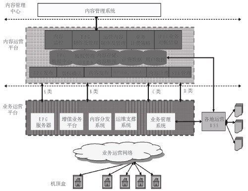 IPTV業(yè)務(wù)對(duì)系統(tǒng)運(yùn)行、管理、網(wǎng)絡(luò)的要求都非常高,因而必須采用分布式結(jié)構(gòu)來(lái)進(jìn)行部署。從部署層次來(lái)分,可分為內(nèi)容管理中心、內(nèi)容集成運(yùn)營(yíng)平臺(tái)、業(yè)務(wù)支撐平臺(tái)。