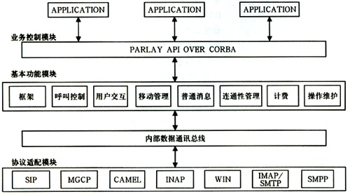 從結(jié)構(gòu)上看,Parlay網(wǎng)關(guān)分為協(xié)議適配模塊(ProtocolAdapter),基本功能模塊(BasicFunction),業(yè)務(wù)控制模塊(ServiceControl)等三個功能模塊,如圖2。