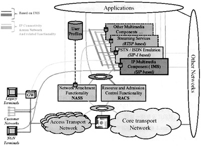 R6中的相關(guān)規(guī)范,但要求支持更多的接入方式,包括xDSL、WLAN、LAN、MAN等。此外,還定義了網(wǎng)絡(luò)附著子系統(tǒng)和資源準入控制子系統(tǒng)(RACS)。在這樣的框架下,NGN可以實現(xiàn)基于SIP的業(yè)務(wù)、基于SIP-I協(xié)議傳統(tǒng)業(yè)務(wù)以及基于RTSP的業(yè)務(wù)等。ETSI