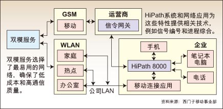 固定/移動(dòng)網(wǎng)絡(luò)融合(FMC)概念已經(jīng)被炒作了兩年之久,其支持者一直都宣稱該技術(shù)可以將手機(jī)和基于室內(nèi)WLAN的無線電話相結(jié)合。今天,供應(yīng)商終于開始部署以特定交換局應(yīng)用為基礎(chǔ)的產(chǎn)品,以及面向手機(jī)的客戶端軟件。西門子移動(dòng)事業(yè)部正在推出針對統(tǒng)一語音網(wǎng)絡(luò)的Hipath MobileConnect產(chǎn)品,而與此同時(shí),新興企業(yè)Divitas網(wǎng)絡(luò)公司也聲稱,其基礎(chǔ)設(shè)施可以充當(dāng)“移動(dòng)/移動(dòng)融合”的角色。