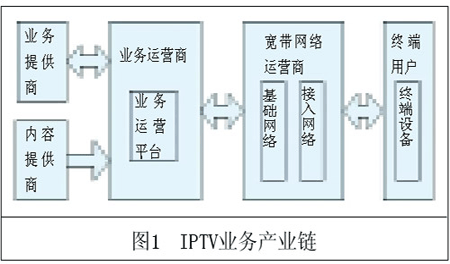 圖1所示的IPTV業(yè)務產(chǎn)業(yè)鏈中,主要角色包括內(nèi)容提供商/業(yè)務提供商(CP/SP)、業(yè)務運營商、網(wǎng)絡運營商和終端用戶。業(yè)務運營商具有IPTV業(yè)務運營資質(zhì),通過業(yè)務運營平臺保證業(yè)務的提供和管理運營,起著業(yè)務主導的作用;內(nèi)容提供商為業(yè)務運營商提供內(nèi)容,業(yè)務提供商向業(yè)務運營商提供增值業(yè)務,使得業(yè)務中的內(nèi)容和種類豐富多彩以滿足用戶的不同需求,內(nèi)容提供商和業(yè)務提供商一般能根據(jù)用戶的使用情況獲取收入分成;網(wǎng)絡運營商通過提供基礎網(wǎng)絡和接入網(wǎng)絡服務保證業(yè)務的傳送和質(zhì)量;終端用戶通過使用終端設備選擇和使用業(yè)務,并支付相關費用。