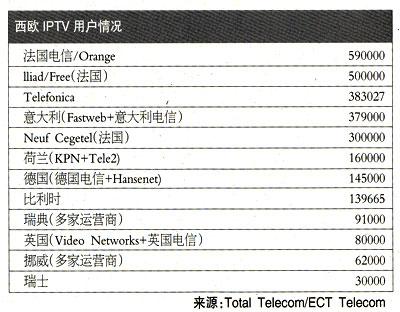 據ScreenDigest的調查顯示,2007年全歐的IPTV訂戶將從去年的290萬增加至560萬,訂戶收費則將從4.7億歐元增加到10億歐元。其中,新訂戶將有近百萬來自法國。