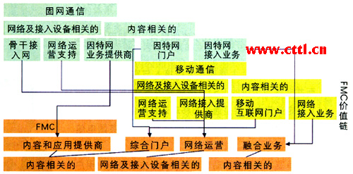 總之,在FMC新配置的價值鏈中,應用和內(nèi)容的作用非常重要,因為他們在融合時將價值鏈中的各個部分連接起來。因此,可以認為內(nèi)容和應用的建立、積累將會推動增值FMC業(yè)務的發(fā)展。今后隨著在內(nèi)容和業(yè)務領域?qū)⒊霈F(xiàn)更多不同的參與者,如內(nèi)容提供商、應用提供商和中間件提供商,F(xiàn)MC價值鏈將進一步得到更深層次的合作、擴張和合并。這些在新的價值鏈中出現(xiàn)的更多獨立但又不同的實體,將直接反映FMC融合的特征。