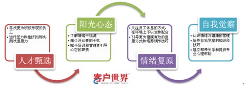 在上述的這三類員工中,我們更希望培養(yǎng)的是第一類,最不想見到的是第三類。但天生就具有很強情緒管理能力的員工,是可望不可求的。如果僅僅是依賴人員的天賦,管理也會陷入更多的“surprise”中,在幾百上千人的呼叫中心出現(xiàn)不可控的局面。我們需要的,也許是個系統(tǒng)化的工程,能夠直面呼叫中心員工需要“情緒勞動”的特點,從另外一個角度去理解和改善員工的表現(xiàn),梳理各項相關(guān)工作,按照如下的步驟形成員工支持體系: