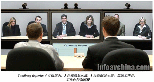 MXP信號編解碼器、4臺高分辨率攝像頭和3臺50英寸的等離子顯示器,用戶播放視頻內(nèi)容,1臺50英寸等離子顯示器安放在中央視頻顯示屏幕下方,顯示數(shù)據(jù)信息。同時,Experia系統(tǒng)還包括了遠(yuǎn)程呈現(xiàn)控制臺,為用戶提供了三種木制造型選擇,控制臺上的3臺麥克風(fēng)構(gòu)成了音頻系統(tǒng)。系統(tǒng)每通信站點支持6位與會者參與會議。與其它遠(yuǎn)程呈現(xiàn)系統(tǒng)一樣,Experia在聲音和圖像方面的性能非常出色,系統(tǒng)使用簡單、穩(wěn)定可靠。泰德的遠(yuǎn)程呈現(xiàn)系統(tǒng)雖然采用與寶利通類似的H.323/SIP標(biāo)準(zhǔn),在系統(tǒng)與業(yè)界標(biāo)準(zhǔn)的協(xié)同工作以及用戶之間互聯(lián)互通的性能方便似乎更勝一籌。